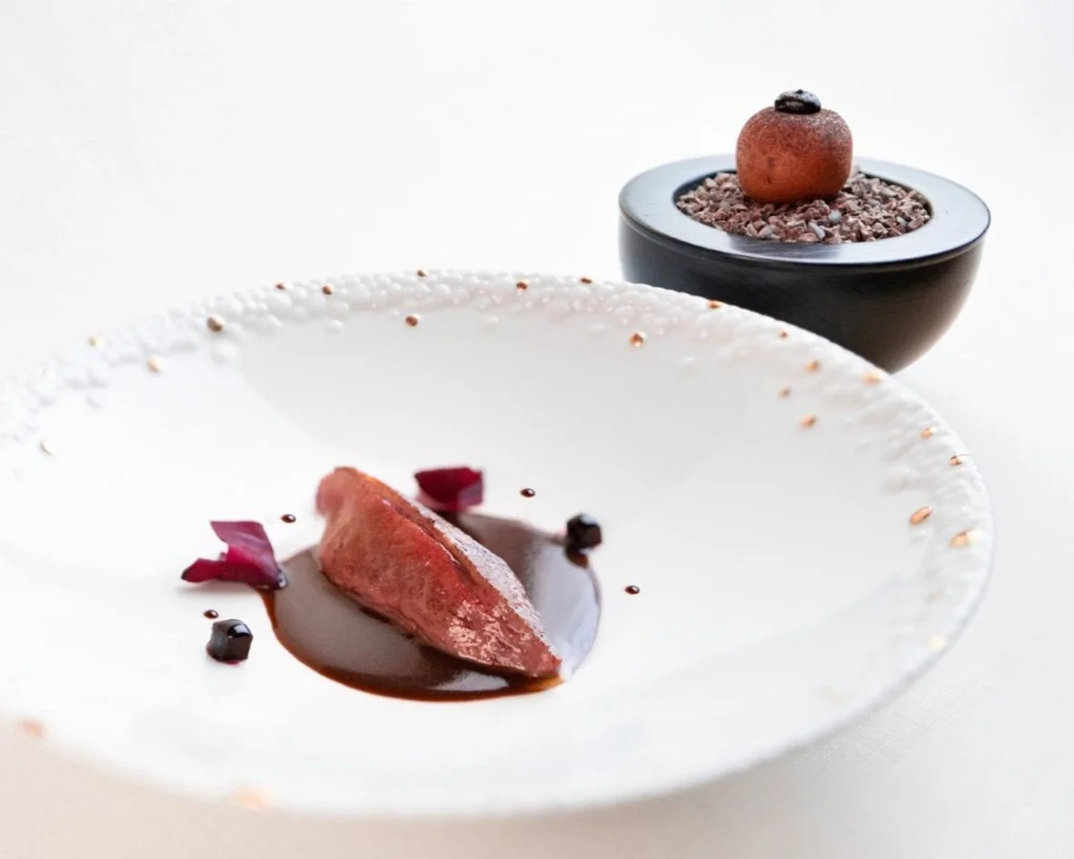 PreparazionePulire i piccioni, separando la carcassa posteriore e svuotando l'interno, riservando solo i fegati per la preparazione del paté. Rimuovere le ali e le cosce posteriori e le teste. Utilizzare le ali per preparare il succo di piccione, Una volta che la carcassa è perfettamente pulita con i petti, scaldare una padella con burro e un filo d'olio di girasole. Quando è molto caldo, introduciamo il piccione dalla parte del petto e lo facciamo cuocere brevemente finché la pelle non è dorata. Togliere dal fuoco e mettere da parte per il passaggio. Togliere i petti, facendo attenzione a non tagliarli, e spennellarli con burro noisette e scalogno. Li introduciamo nel grill per temperarli e dare loro un tocco di fuoco e, quando li tiriamo fuori, li tagliamo al centro. Aggiungere sale e pepe e lasciare riposare per qualche secondo. Quando è il momento di impiattare, lo introduciamo nel sugo di piccione e lo mettiamo al centro del piatto. Glassare con il sugo di piccione reale.